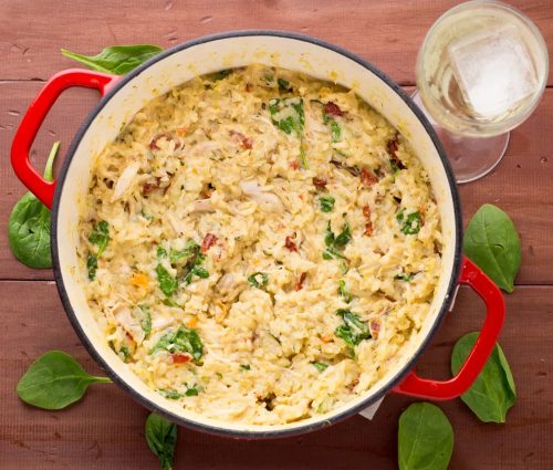 Cibuľu nakrájame nadrobno a speníme na troche oleja (masla). Pridáme prepláchutú ryžu a chvíľku ju poopekáme na cibuľke. Pridáme horúcu vodu (vývar) a víno v takom množstve, aby bola ryža rovnomerne zaliata. Dobre ju premiešame, osolíme, okoreníme a stále miešame. Keď sa nám zdá, že je suchá, prilejeme víno a vodu (vývar), ryža musí byť stále „tekutá“, ale nie vodová. Radšej prilievame tekutiny častejšie v menších množstvách. Takto ryžu varíme asi 15 – 20 minút. Pred dovarením pridáme parmezán, zamiešame, pridáme nakrájané sušené paradajky a nasekaný medvedí cesnak. Na záver primiešame kokosovú smotanu, premiešame, aby sa zahriala a odstavíme zo zdroja tepla. Podávame s bielym vínom, môžeme posypať i parmezánom.