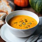 1 hokkaido tekvica,1 mrkva, 2-3 zemiaky, 2l zeleninového vývaru, 3 PL olivového oleja, korenie čierne celé, korenie nové, kurkuma, 2 strúčiky cesnaku, muškátový orech, 1 balenie Body&Future Coconut cuisine, opražené tekvicové semienka.