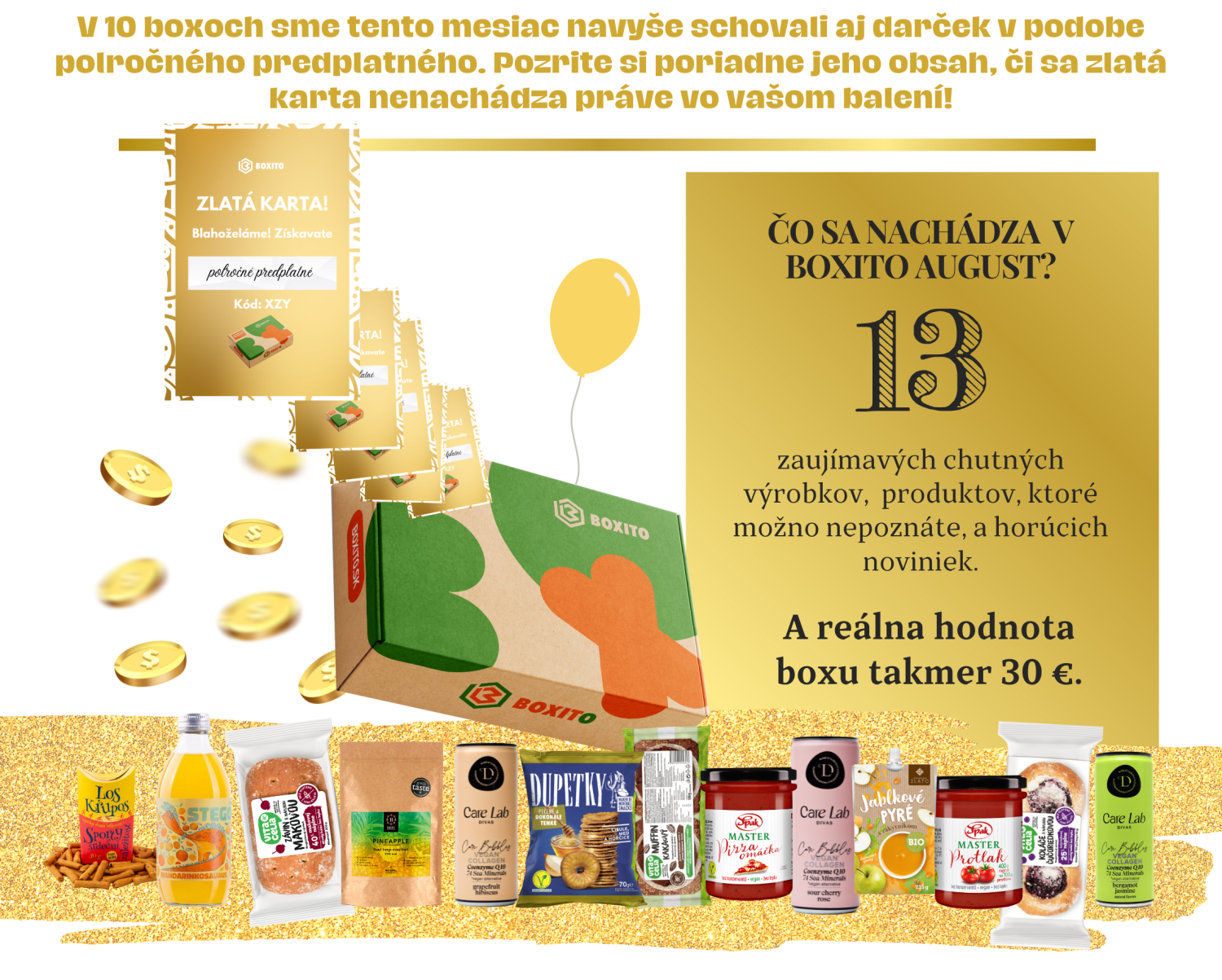 V BOXITO august sme si pre vás pripravili tému, ktorá tu ešte nebola! Ale GOLDEN neboli len zlaté karty, ktorými sme sa rozhodli potešiť desiatich z vás, ale aj obsah boxu. Čo sa v BOXITO AUGUST nachádzalo?