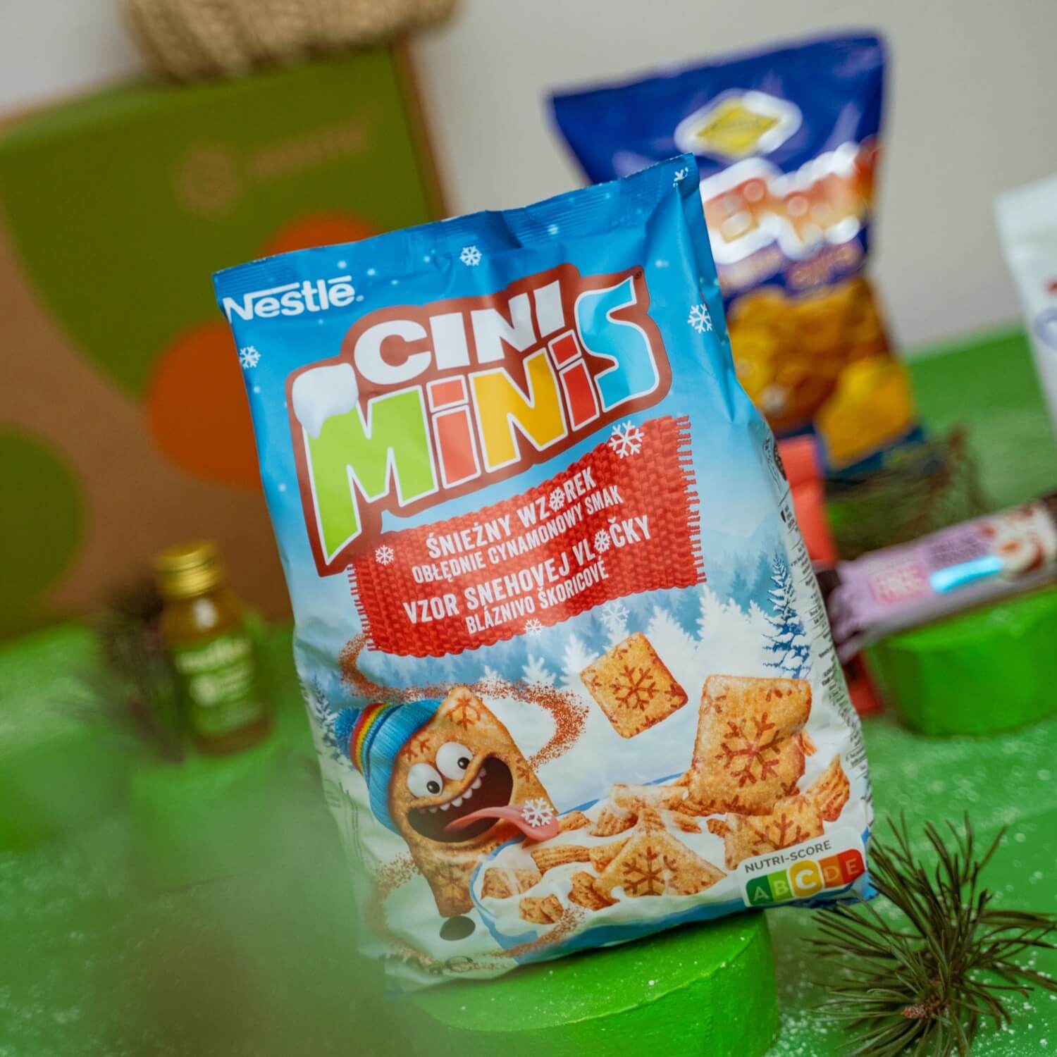 Bláznivo cereálne štvorčeky so škoricou, s vitamínmi a železom. Raňajkové cereálie CiniMinis v kombinácii s teplým mliekom a teraz aj so vzorom snehových vločiek.