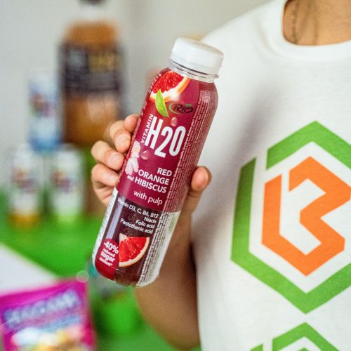Pramenitá voda s dužinou z červeného pomaranča obohatená o výluh z kvetu ibišteka.