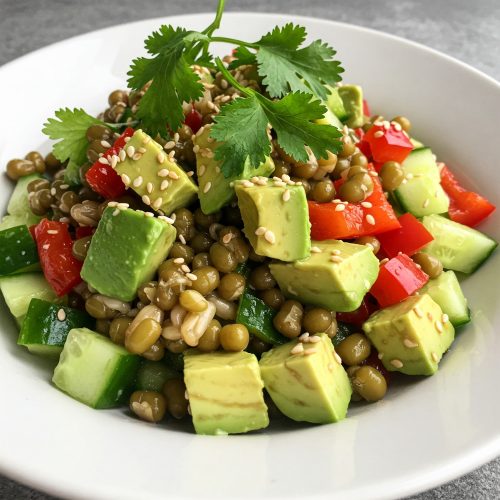 - V miske premiešame mungo fazuľky s nakrájanou zeleninou a nasekaným koriandrom.